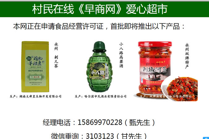 蒋宗霖给村民在线空运来了精心预包装的“寻源乐牌”东安鸡表示祝贺,祝贺村民在线一鸣惊人;永州双牌还送来了剁椒河鱼;湖南大舜皇集团还送来了舜赐茶;哈尔滨申氏酒业送来了国民美酒申小白及小八路酒。 甄仕荣总经理考虑到举办首届“世界华人健康(食品)节”对地方崛起的重要性,27日下午就与永州市及冷水滩区有关领导进行了汇报。(甘当梯) |