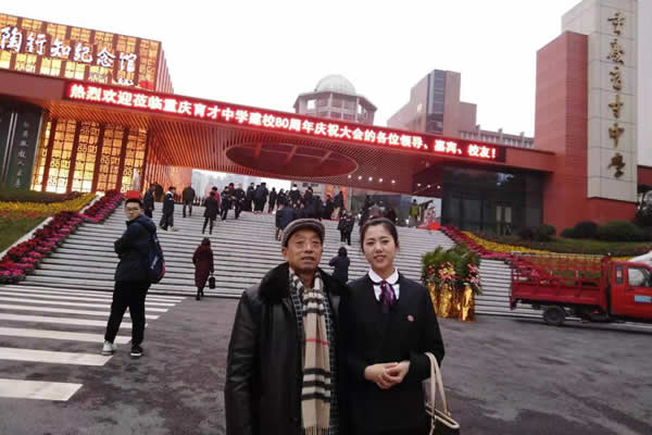 12月30日上午11时许,当我们走下飞机来到重庆江北国际机场 T2出口处时,便见到了杨秋兰老师手举着一块写有“重庆育才中学80周年校庆接机处”的红底白字标牌,在迎接我们。杨老师十分热情地接待我们在入住的酒店安顿和用餐之后,便领着我们来到了距住所不远处的庆典现场——重庆市九龙坡区的育才中学本部。 校区临街而建,门前是一条车马龙马的宽阔大道,大道上还建有一座横空出世的彩虹式天桥。站在桥上,庆典现场的恢宏气势便扑入我们的视野。放眼望去,校门的左侧高楼林立,临近校门的“师陶楼”上悬挂着红底白字的竖幅长联: 八秩师陶鹏举鸿飞李绽桃开辉寰宇, 九心归一龙盘虎跃蛟腾凤起耀中华。 校门的右侧座落着一座水立方式的矩型现代建筑,红白相间的竖格式墙体上方镌刻着“陶行知纪念馆”的6个洁白大字。校门口的过道上方横悬着一幅红底白字的巨幅标语:“热烈欢迎莅临重庆育才中学建校80周年庆祝大会的各位领导、嘉宾、校友!” 陶行知先生的巨型汉白玉雕塑像就屹立在校门内侧的过道中央,在花团锦簇中闪得熠榻生辉。校门内外的广场上己是摩肩接踵的人群。原来,这里刚刚举行过陶行知雕塑像的揭幕仪式和陶行知纪念馆的开馆仪式,参加育才中学建校80周年庆祝大会的报到处和签名墙,就分列在陶行知雕塑像的过道两旁。 就在这样热烈欢庆的氛围之中,杨秋兰老师领着我们在报到处报了到、领了校庆材料袋和到签名墙上签了名。晚上,她还陪同我们与参会者一同在校园的大礼堂里,观看了由育才学校师生主演的话剧《陶行知在重庆》。 如此等等,在任何平常的叙述语言难以表达胸中之意的我,怎能不热血沸腾:育才建校八十年,举行庆典盛空前。应邀共享今报到,欣赏话剧观校园。万世师表陶行知,捧心奉献筑宏愿。改革开放获新生,而今育才群芳艳。